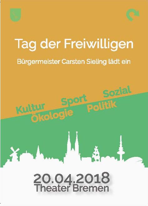 Auch in diesem Jahr will die Stadt Bremen das Engagement von fast 700 Freiwilligen im FSJ, FÖJ, BFD usw. gebührend würdigen. Daher sind alle jungen Engagierten am 20.4.2018 um 14 Uhr ins Bremer Theater eingeladen. Es erwarten euch etliche tolle und witzige Darbietungen der verschiedenen Träger. Sowie eine kleine Überraschung. Nehmt euch die Zeit um der Bremer Öffentlichkeit zu zeige, wieviele von euch sich überall in Bremen engagieren.
