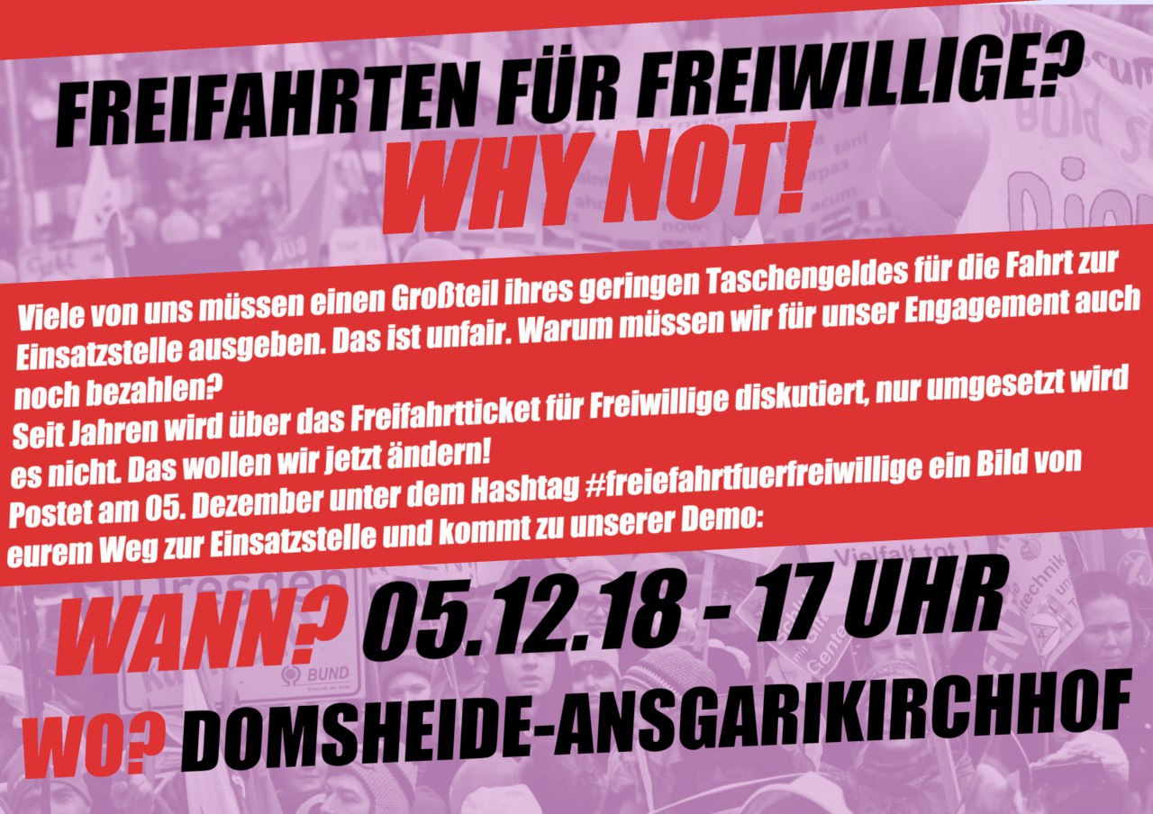 Heute findet bundesweit ein Aktionstag aller Freiwilligen statt. Es wird Zeit, dass das Engagement all der Tausenden jungen Menschen mit einem kostengünstigeren oder sogar kostenlosen Nahverkehrsticket honoriert wird. Viele nehmen lange Wege und nicht unerhebliche Fahrtkosten auf sich, um in ihren Einsatzstellen Kinder, Senioren und erwachsene Menschen zu unterstützen, um sich für wichtige Themen wie Nachhaltigkeit und Klimaschutz einzusetzen oder sich in kulturellen Projekten zu engagieren. Treffpunkt 17 Uhr Domsheide!