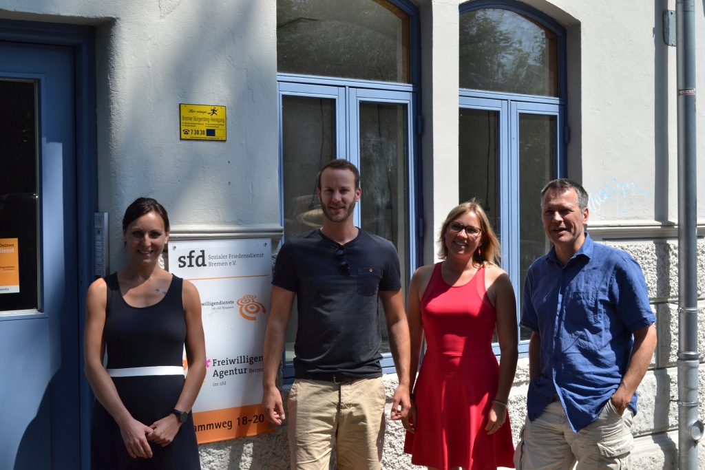 In den 70er Jahren als Alternative zu anderen Zivildienstorganisationen gegründet, gab es über zehn Soziale Friedensdienste in Deutschland. Heute existieren nur noch zwei: der sfd Bremen e.V. und der sfd Kassel. Beide Organisationen betreuen (junge) Menschen im Übergang zwischen Schule und Beruf und unterstützen und fördern das zivilgesellschaftliche Engagement von Menschen in ihrer Stadt. Beide verbindet die Idee, an einer demokratischen Gesellschaft mitzuwirken. Zwei Tage lang waren drei Mitarbeiter*innen aus Kassel bei uns zu Besuch in Bremen, zum Austausch über die Arbeit mit Freiwilligen und die Gestaltung interner Verwaltungsabläufe. Wir finden, eine Begegnung, die wir unbedingt fortsetzen wollen.